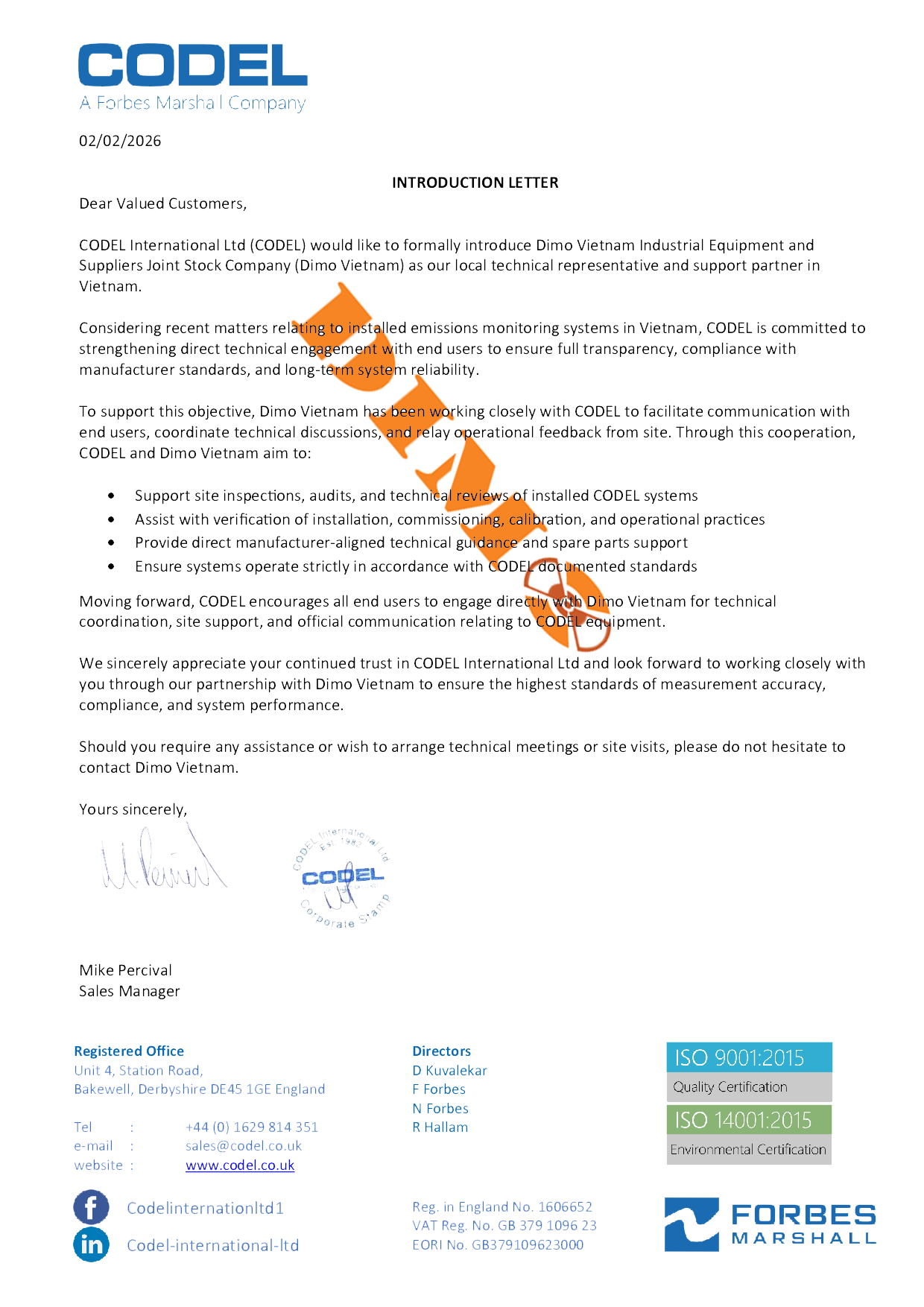 8. Đại diện Hãng Codel (UK) tại Việt Nam: Chuyên thiết kế và sản xuất các thiết bị quan trắc khí thải tiên tiến, phục vụ giám sát môi trường không khí, hầm giao thông và an toàn công nghiệp.